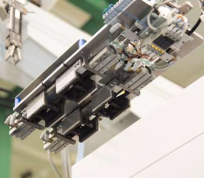 In addition to the method for inserting metal stamped inserts into dies manually or using a robot, we have also developed an in-house method for inserting a coiled metal material into the line then separating the pressed item after molding (hoop molding method). Installing sensors and cameras has also enabled us to build automated molding lines that can operate a maximum of 24 hours a day without human intervention.